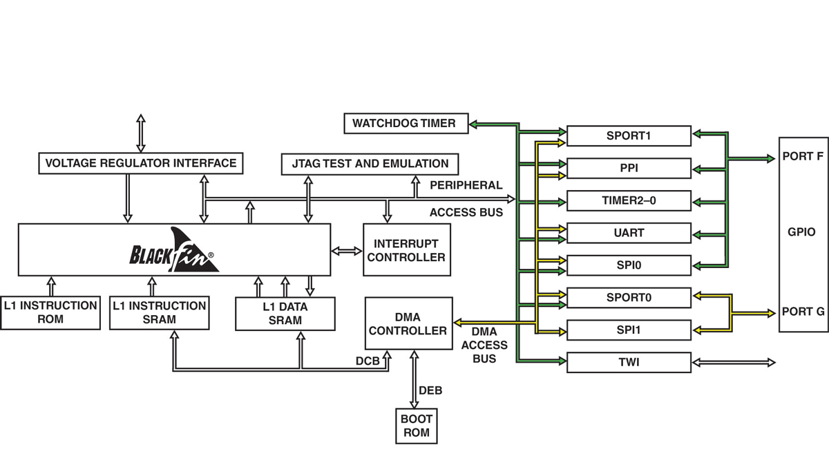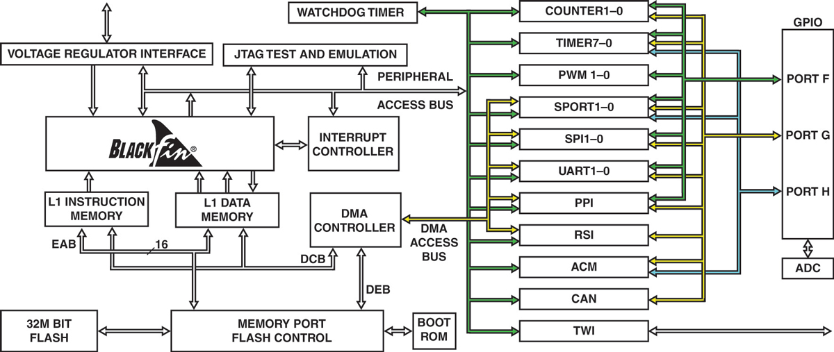 The Blackfin processor family includes devices that target applications in the consumer, automotive, industrial, instrumentation, and communications markets. To address these markets, the Blackfin processor family offers scalable performance from the 200 MHz ADSP-BF535 to the dual core 600 MHz ADSP-BF561 to the ADSP-BF52x with advanced peripherals to the low power ADSP-BF51x family with real-time Ethernet capabilities and the ADSP-BF50x with 4 MB onboard executable flash memory and a 12-bit dual SAR ADC (analog-to-digital converter).