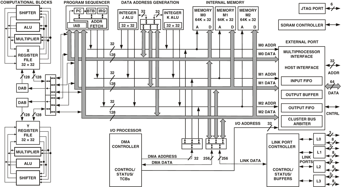 The ADSP-TS201, TS202, and TS203 operate at a maximum frequency of 600 MHz and offer up to 24-Mbits of embedded DRAM effectively operating at core speed. The ADSP-TS20X processors include four 128-bit wide internal buses to support simultaneous access of four individual internal memory banks. The inclusion of LVDS serial Link Ports, coupled with a configurable parallel port known as the Cluster Bus, deliver up to an aggregate 5-Gbytes of non-intrusive external bandwidth per second.