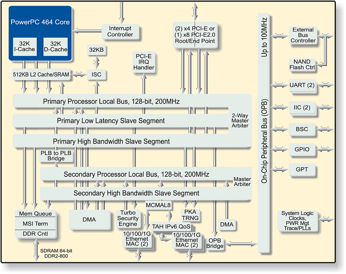 The PowerPC 460GTx, based on the Power Architecture, combines a performance optimized PowerPC core with a high-bandwidth memory and I/O subsystem to support networking and telecommunication applications. The high-performance CPU core is coupled with high-bandwidth memory and high-speed I/0 subsystems support for encryption/decryption, security, Gigabit Ethernet and Gen2 PCI Express. The PowerPC 460GTx provides a migration path for developers using AppliedMicro PowerPC 440GX and 460GT processors. The PowerPC 460GTx embedded processor features a PowerPC superscalar CPU core with clock frequencies ranging from 800MHz to 1.4GHz and performance of 2 DMIPS/MHz (2800DMIPS at 1.4GHz).