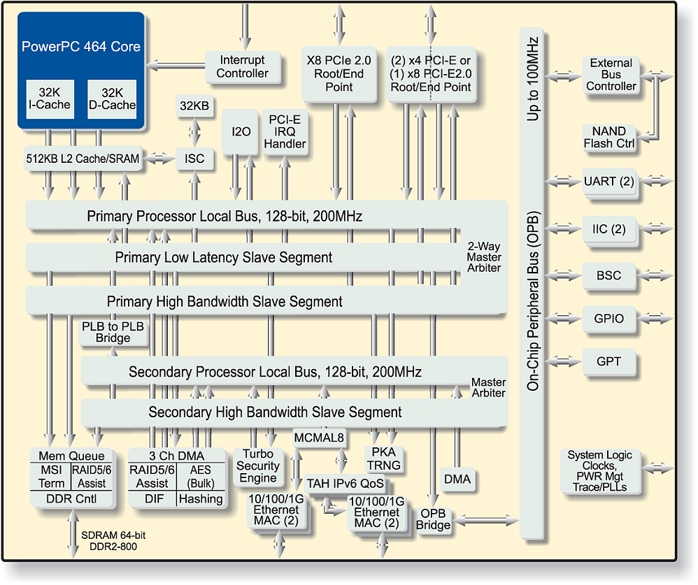 The PowerPC460SX is AppliedMicro's storage processor family. Based on the Power Architecture standard, the PowerPC 460SX storage processor integrates a PowerPC core and specialized functions for high-performance storage and storage networking applications. The PowerPC 460SX targets the requirements of server direct-attached and external storage applications. The combination of high-performance IO and memory subsystems also make the PowerPC 460SX suitable for high-bandwidth protocol bridging applications. The PowerPC 460SX, with clock frequencies ranging from 833MHz to 1.4GHz, provides multiple PCI Express Gen 2 interfaces for high bandwidth peripheral connectivity and efficient PCIe to PCIe bridging. For storage applications, the PowerPC 460SX provides high throughput RAID 5 and RAID 6 hardware-acceleration support capable of achieving 1500MB/s RAID 5 and 1400MB/s RAID 6 full stripe write performance. It also includes XTS-AES and GCM-AES encryption acceleration that is compliant with the IEEE 1619 and 1619.
