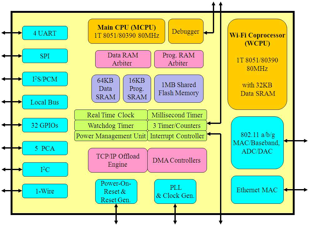 The dual-CPU architecture of AX22001 utilizes the host processor core for applications and TCP/IP processing and the Wi-Fi processor core for WLAN protocol processing and Ethernet to WLAN packet format translation. The built-in WLAN MAC and Baseband processor are compatible with IEEE 802.11a/b/g standard, and support security features compatible with 802.11i and QoS features compatible with IEEE 802.11e, and support operation in Infrastructure or Ad-Hoc (IBSS) network topology.