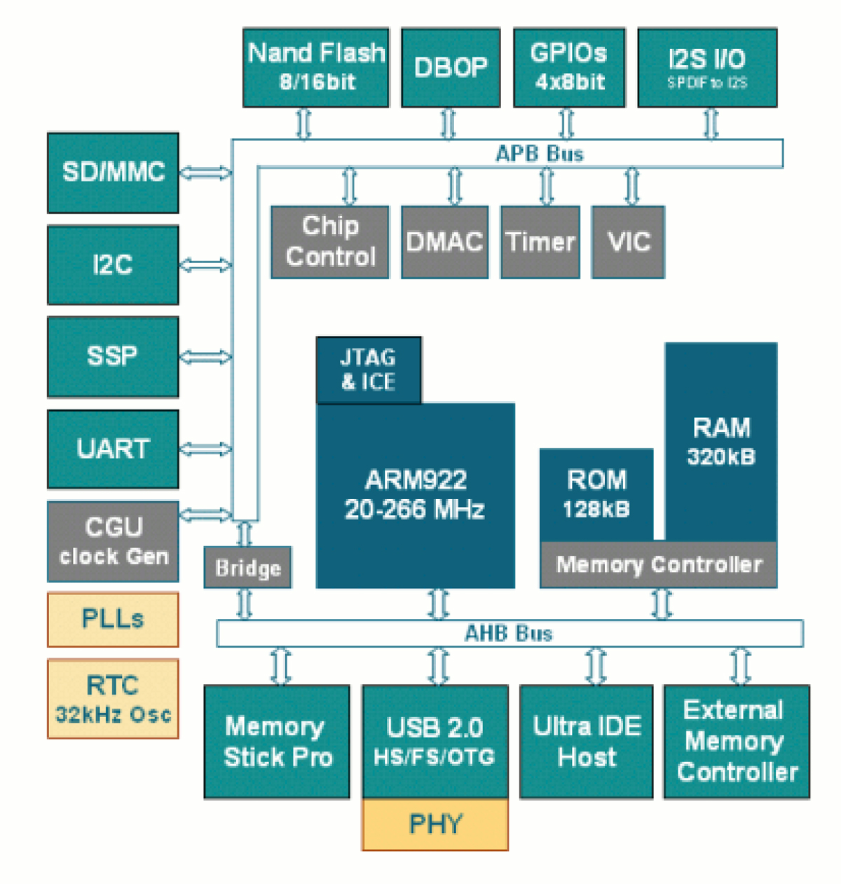 The AS3524 is an ultra low-power microcontroller based on the ARM9 32-bit processor with fully integrated high performance audio features and system power management in a single package. It features 8-kbyte instruction and 8-kbyte data cache memories and embedded 320-kbyte SRAM with performance from 20 to 266 MHz operation. The AS3524 features dedicated high-speed interfaces for ATA IDE, USB2.0 HS-OTG, and SDRAM. It include interfaces for NAND flashes, MMC/SD cards, and Memory Stick. Two independently programmable PLLs generate the required frequencies for audio playback/recording, for the processor core and for the USB interface at the same time. AS3524 is available in a small footprint of 10x10 mm, 180 CTBGA RoHS-compliant package.