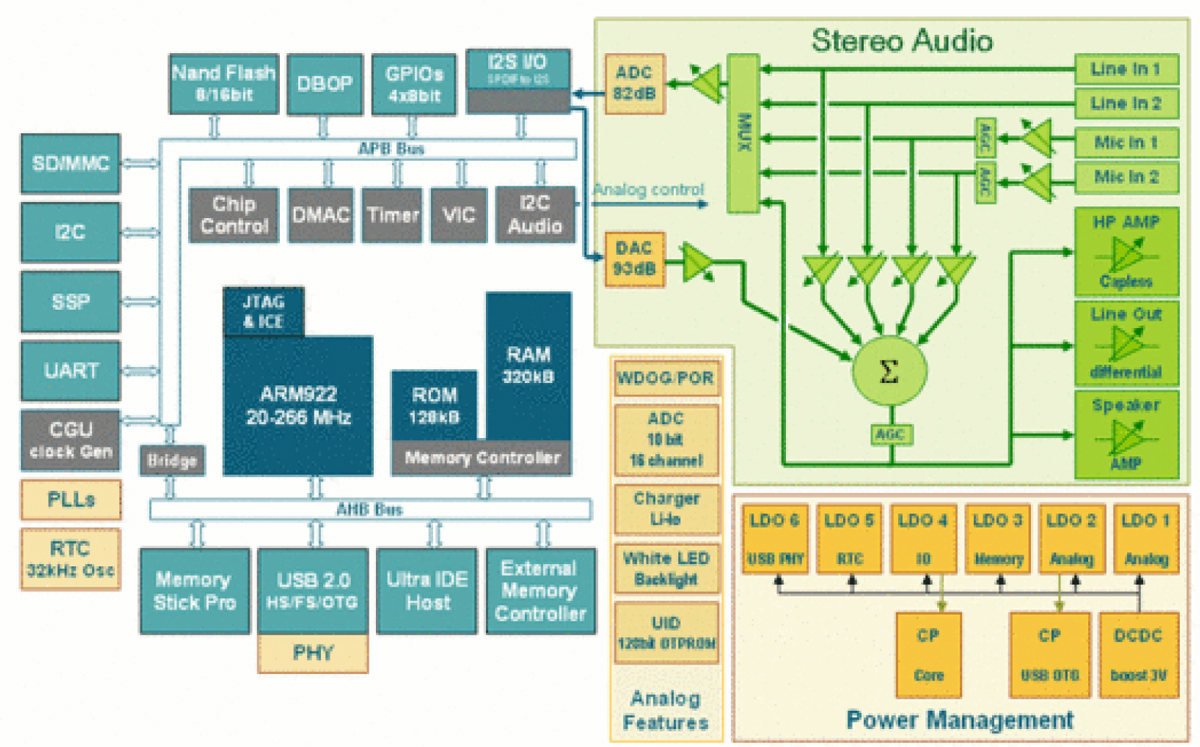 The AS3525 is an ultra low-power microcontroller based on the ARM9 32-bit processor with fully integrated high performance audio features and system power management features. It features 16-kbyte cache memories and embedded 320-kbyte SRAM with performance from 20 to 266 MHz operation. The AS3525 includes dedicated high-speed interfaces for USB2.0 HS-OTG (AS3525A+B), ATA IDE, and SDRAM (AS3525A only). Memory interfaces support NAND flashes, MMC/SD cards, and Memory Stick.