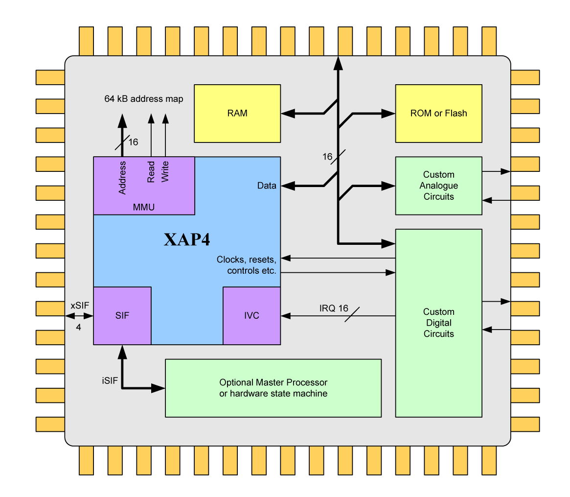XAP4a is a soft IP (intellectual property) core written in Verilog RTL for synthesis to either ASIC or FPGA for verification. The core is implemented in around 12k gates including all of its registers. It can be laid out in under 0.04 mm2 on 90 nm. ASIC designers using XAP4 will customize its Memory Management Unit to interface their peripherals and memories, typically Flash and RAM, and also the Interrupt Vector Controller to prioritize interrupts and generate an interrupt vector.