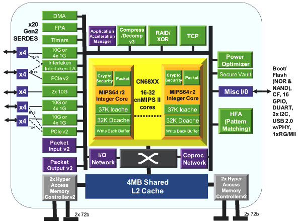 The Cavium Networks OCTEON family of Multi-Core MIPS64 processors is scalable, high-performance, and low-power solution for intelligent networking applications ranging from 100 Mbps to full-duplex 10 Gbps. These software-compatible processors, with one to sixteen cnMIPS cores on a single chip, integrate next-generation networking I/Os along with advanced security, storage, and application hardware acceleration, offering throughput and programmability for the Layer 2 through Layer 7 processing requirements of intelligent networks.