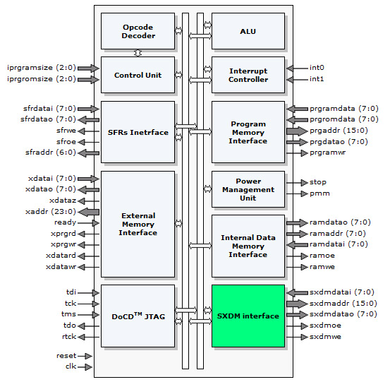 The DP8051CPU is an ultra high performance, speed optimized soft core of a single-chip 8-bit embedded controller dedicated for operation with fast (typically on-chip) and slow (off-chip) memories. The core has been designed with a special concern about performance to power consumption ratio. This ratio is extended by an advanced PMU (power management unit).