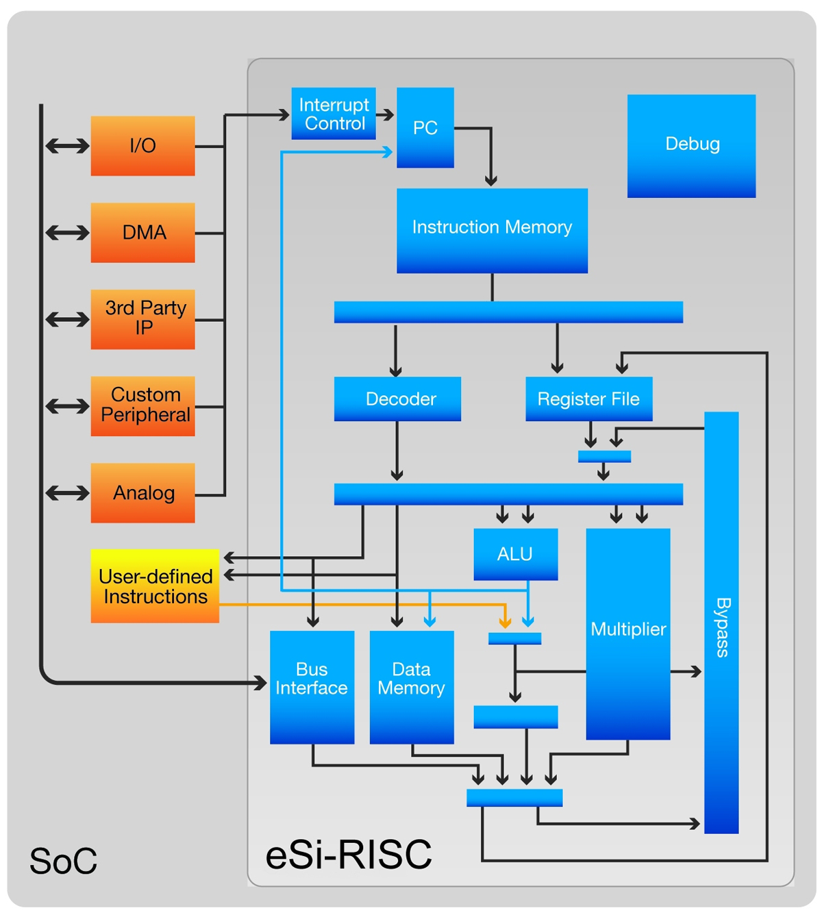 The core employs a 5-stage pipeline and static branch prediction. The eSi-3200's instruction set includes arithmetic and logical instructions (including barrel-shift, multiply and divide), comparisons, load and stores, branches and calls as well as system level instructions to control interrupts and enter lower power states. There are optional instructions and addressing modes available, and developers can add their own user-defined instructions and registers. Instructions are encoded in either 16 or 32-bits, depending upon the size of the operands and the type of instruction. All of the commonly used instructions can be encoded in 16-bits.