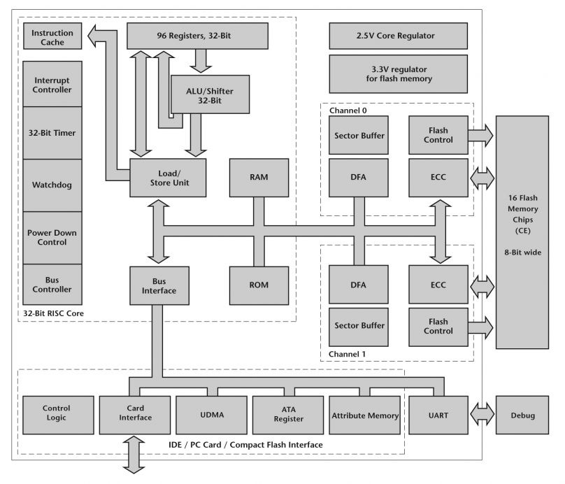 The F4 NAND flash controller targets high-speed Compact Flash (CF) cards and PATA/IDE Solid State Disk Drives. This controller is derived from the Hyperstone E1 32-bit RISC/DSP processor. The F4 contains dual flash channels, each with its own DFA processor (Direct Flash Access-similar to DMA), and two 4-kbyte sector buffers per channel. It supports SLC and MLC flash from all vendors and is optimized for 4-kbyte/page MLC flash. The F4 supports CFA4.0 and ATA6 specifications and is capable of sustained speeds of greater than 40MB/sec read and greater than30 MB/sec write. Commercial and industrial temperature versions are available. Robust flash management and patented wear leveling are implemented in firmware stored in the flash. A complete set of software tools is provided for card initialization and preformatting.