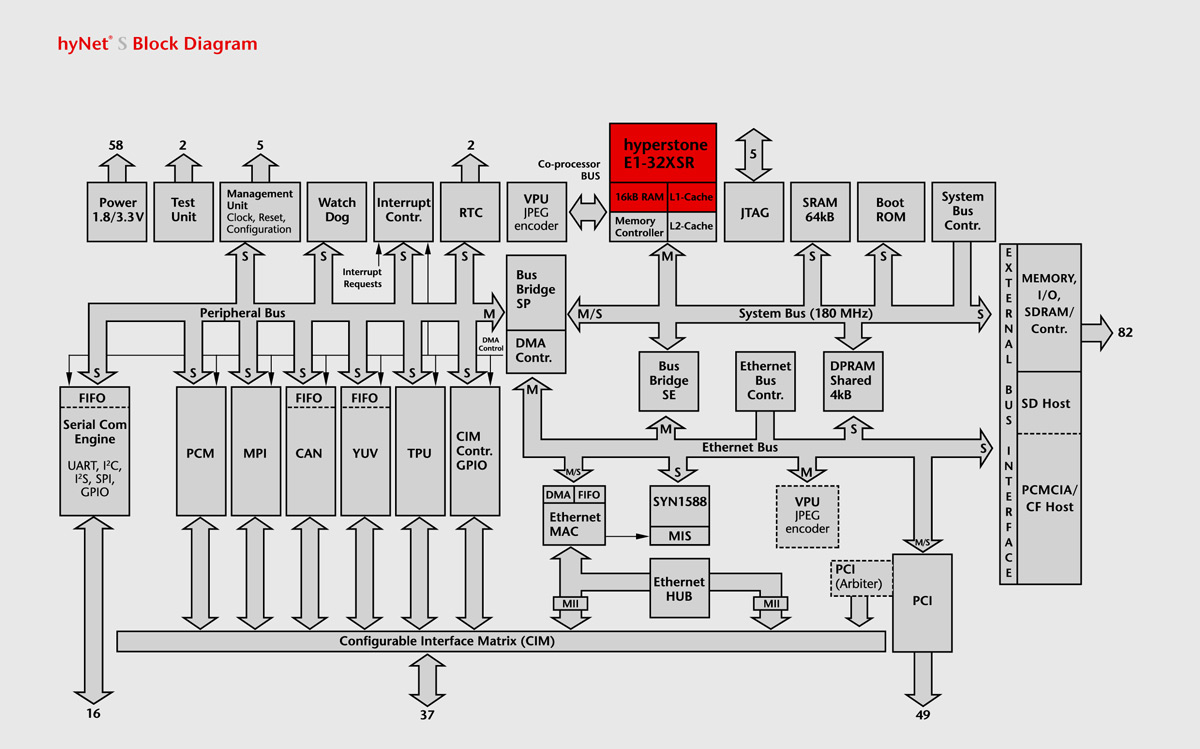 The HyNet32S/32XS is a networking processor based on the E1-32XSR RISC/DSP processor core. The HyNet32XS processor uses a maximum clock rate of 180 MHz and adds communication support via integrated peripherals. In addition to support for Ethernet, USB2.0 and CAN, the HyNet 32XS also supports CCIR656-compliant video inputs.