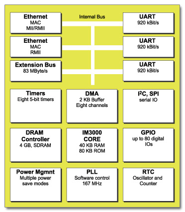 The IM3910 is a dedicated controller for networked applications in real-time environments. Its high energy-efficiency and ability to deliver a sustained throughput of 83 Mbyte/s makes it also an ideal choice for performance critical operations in battery powered devices. The microcoded architecture outperforms typical RISC processors in applications where memory size, component count and power consumption must be kept at a minimum. Enabled with Java, the IM3910 provides remote management capabilities and support for various user interfaces. Applications with networked equipment, graphical user interfaces, internet connections and battery operation will leverage on the IM3910 controller.