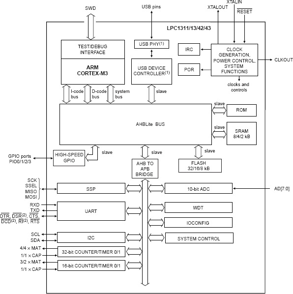 The peripheral complement of the LPC13xx devices includes up to 32-kbytes of flash memory, up to 8-kbytes of data memory, USB Device (LPC1342/43 only), one Fast-mode Plus I²C-bus interface, one UART, four general-purpose timers, and up to 42 general-purpose I/O pins. The LPC1300 also enables in-system programming and in-application programming via on-chip bootloader software. USB Mass Storage and HID class drivers are included on-chip enabling quick setup of USB communication. These drivers are incorporated in ROM, leaving 100% of the user Flash space for the application.