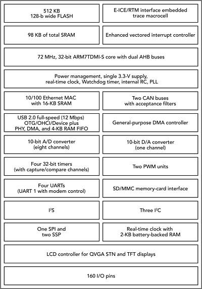 There are four 16C550 UARTs (one with IrDA), three I²C-bus interfaces, three SPI/SSP interfaces, an I²S interface, and an interface for SD/MMC memory cards. There are four 32-bit capture/compare timers, two PWM units for three-phase motor control, a low-power real-time clock with 2-kbyte of battery-backed SRAM, a Watchdog timer with multiple-clock source options, and a 4 MHz internal RC oscillator that can be used as the main system clock. An independent clock divider for each peripheral lets the designer minimize power consumption. Each pin of Port 0 and Port 2 can be used as an external interrupt. There are 160 general-purpose I/O lines that toggle at rates up to 36 MHz.