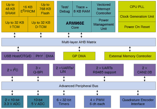 The integrated CAN 2.0B controllers offer FullCAN mode for message reception, triple transmit buffers with automatic priority scheduling and extensive global CAN-acceptance filtering for high-performance gateway functionality. A USB 2.0 Full-Speed Host/OTG/Device interface is also available.