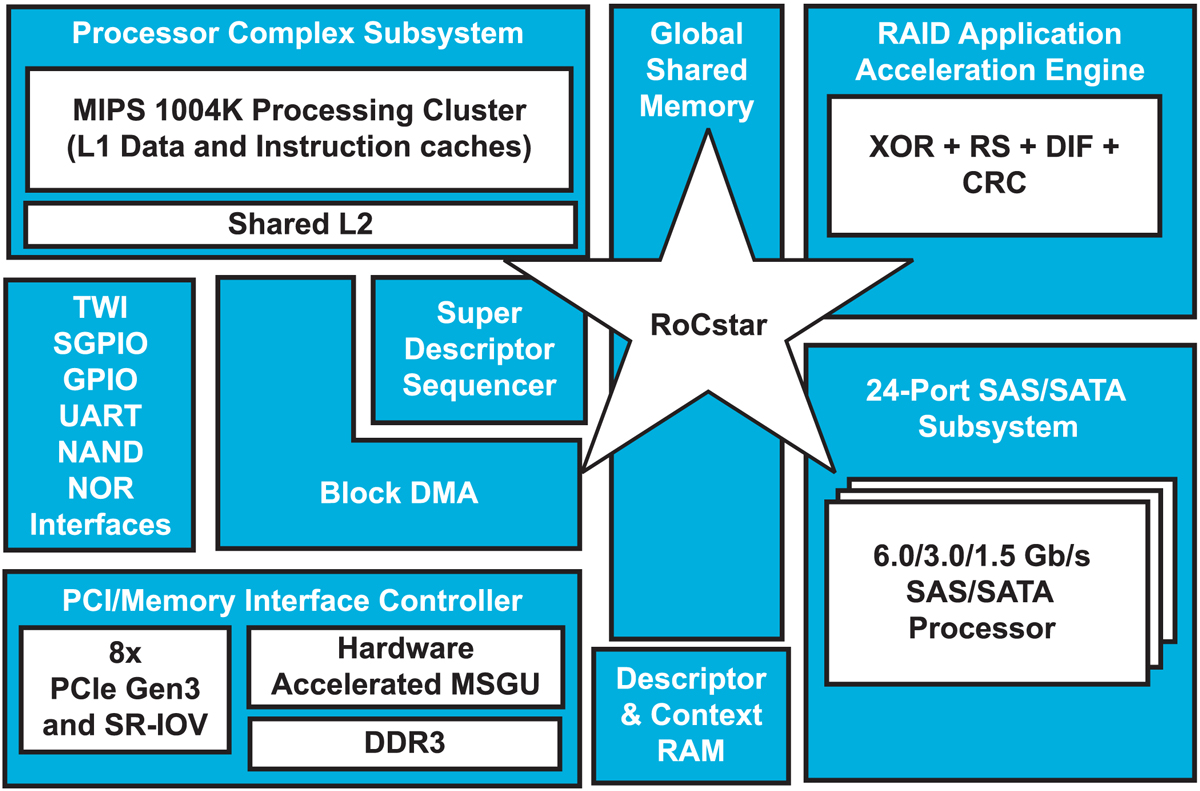 The PM8015 SRCv 24x6G is a PCIe Gen 3 to 24-port, 6 Gb/s SAS RAID-on-Chip (RoC) controller designed for enterprise servers and RBODs. The SRCv 24x6G supports the SAS 2.1 specification. The MIPS processing cluster includes multi-threading to increased processing capability, and it is backward compatible with existing SRC-based designs. The 2-Mbytes of ECC-protected global memory is accessible as shared L2 cached with coherence and its hardware FIFO and semaphores support 76.8 Gbyte/s data throughput. The DD3 controller supports up to 4 Gbytes of DDR3 DRAM scalable from DDR3-800 to DDR3-1600.