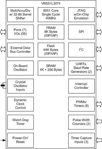 The VRS51L3074 is a Ramtron FRAM-Enhanced 8051-based microcontroller that reaches 40 MIPS and incorporates 8-kbyte of FRAM, 64-kbyte ISP/IAP of Flash, and 4352 bytes of SRAM. The device suits applications that require nonvolatile memory for data storage. The VRS51L3074 uses the same instruction set as standard 8051s.