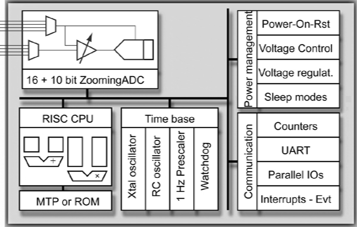 The XE8801A is a data acquisition ultra low power, low-voltage, SoC (system on a chip) with a microcontroller delivering 1 MIPS at 300uA and 2.4 V, and multiplying in one clock cycle. The XE8801A includes a acquisition path with16+10 bits. The XE8801A is available with on chip ROM (SX8801R) or Multiple-Time-Programmable (MTP) program memory. The XE8801A targets battery and current loop powered instruments, pressure and chemical sensors, HVAC control, metering, and wrist instruments.