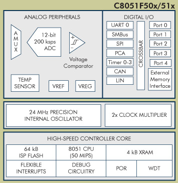Silicon Laboratories' CAN interface family of microcontrollers integrates world-class analog with high-speed digital and Flash memory into a single, powerful system-on-a-chip. Each CAN microcontroller features a 25 MIPS pipelined 8051 CPU, an integrated CAN 2.0B controller, up to 64-kbytes of Flash, 4-kbytes of SRAM, an external memory interface, and digital I/O options. Dual UARTs, SMBus and SPI and on-chip analog capabilities including ADC, DAC, voltage reference, internal oscillator and temperature sensor make these products suitable for industrial control and automotive applications.