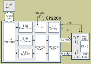 The CP220x is a single-chip Ethernet controller containing an integrated IEEE 802.3-compliant Media Access Controller (MAC), a 10Base-T Physical Layer (PHY), and 8-kbytes of non-volatile Flash memory available in either a 28-pin QFN (5 x 5 mm), or 48-pin TQFP (9 x 9 mm) package. The CP220x can add Ethernet connectivity to any microcontroller or host processor with 11 or more port I/O pins. The 8-bit parallel external memory interface bus supports both Industry-standard Intel and Motorola bus formats in multiplexed and non-multiplexed mode. The CP2201, 28-pin QFN package, supports multiplexed addressing only. Mode select pins are used to select the bus interface mode.