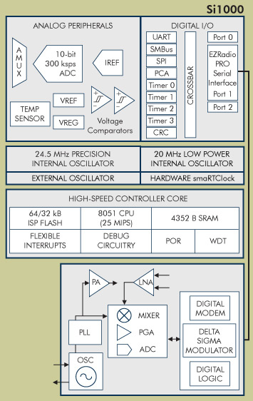 The Si10xx wireless microcontrollers combine a 25 MHz 8051 core, EZRadioPRO sub-GHz RF transceiver, up to 64-kbytes of flash and up to 12-bit ADC – all in a 5x7 mm package. The Si10xx wireless microcontrollers offer low active-mode current consumption (160 microamps per MHz). In sleep mode, they consume 615 nanoamps with an active 32.768 kHz real-time clock (RTC) and down to 315 nanoamps with an active RTC and a low frequency oscillator (LFO). In deep-sleep mode, they can operate on as little as 25 nA with full RAM retention.