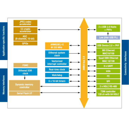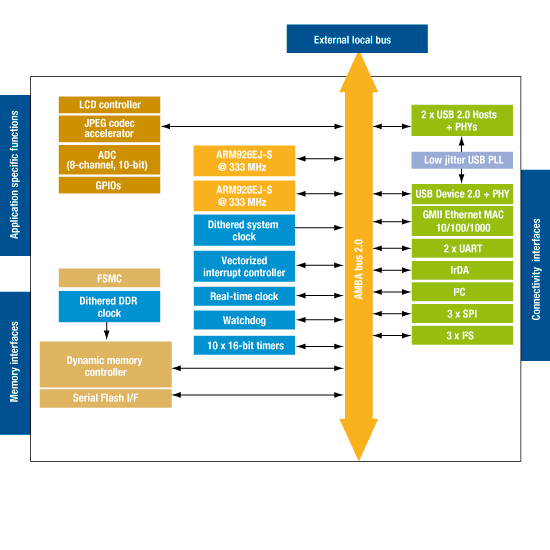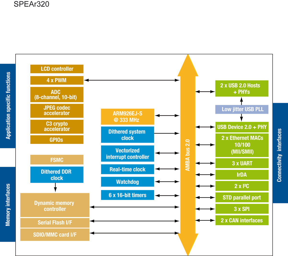 The SPEAr320 design targets factory automation, printers, and consumer applications. It features a high-performance 8-channel DMA, a C3 cryptographic accelerator, real-time clock, watchdog, system controller, JPEG accelerator, ADC, and up to 102 GPIOs. It includes 32-kbytes of ROM, up to 8-kbytes of SRAM, as well as external memory management of LPDDR2, DDR2, SRAM, and NAND/NOR Flash memories. Connectivity peripherals include USB 2.0, Ethernet (two MII/SMII), standard parallel port, SPI, I²C, UART, IrDA, and CAN.