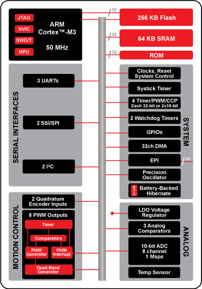 The TI Stellaris family of microcontrollers are based on the ARM Cortex-M3 v7-M processor; the microcontroller member of the ARM Cortex processor family. The Stellaris family provides entry into the ARM ecosystem. At the heart of the Cortex-M3 processor is an advanced 3-stage pipeline core, based on the Harvard architecture, incorporating features such as branch speculation, single cycle multiply and hardware divide.