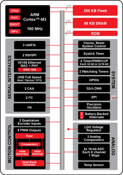 TI's LM3S9000 Series of Stellaris ARM Cortex-M3 microcontrollers feature combinations of industrial connectivity, expanded motion control I/O, larger on-chip memory, and low-power optimization targeting battery-backed applications such as motion control, medical instrumentation, HVAC and building control, factory automation, transportation, remote monitoring, electronic point-of-sale machines, network appliances and switches, and gaming equipment. The LM3S9000 series integrates 10/100 Mbps Ethernet, USB Full Speed On-The-Go, and Bosch Controller Area Network networking in the same device.
