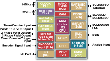 The on-chip SRAM and FLASH run with zero wait states for fully deterministic operation (no software timing variability due to caching). Real-time debugging is support via the ARM Coresight on-chip debug module with ETM real-time trace. TMPM380 is also suitable for general-purpose microcontroller application where 5V VCC is required for improved noise immunity or to drive 5V circuits. The microcontroller includes GPIO, serial interfaces, CPU clock frequency monitoring, power reset and low-voltage detect circuits. The FY series offers 256-kbyte Flash and 16-kbyte SRAM. The FW series offers 128-kbyte Flash and 12-kbyte SRAM. Evaluation kits with CMSIS library will be available Q4 2010.