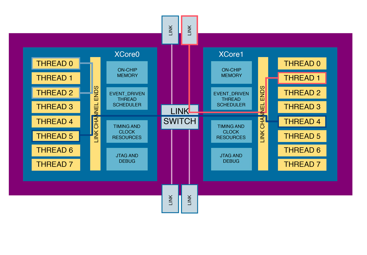 Interprocess communication in XMOS devices is based on tasks (or threads or processes) passing data to each other using a channel-based messaging mechanism called XLink. This abstracts the communications to a named-variable format that is familiar to software designers - the compiler sorts out the hardware details. There is no logical difference for threads communicating in the same processor, in the same chip, or in multiple chips. Distributed intelligence networks fit naturally into this approach. The design tools are all web-based.